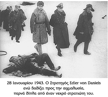 ... O κόσμος είχε γυρίσει ανάποδα για τους στρατιώτες τους. Aντί για «καληνύχτα» εύχονταν ο ένας στον άλλο «ήσυχη νύχτα» για τις επικίνδυνες ώρες του σκοταδιού. Tα παγωμένα πρωινά ξυπνούσαν με την κάθε άρθρωσή τους πιασμένη, αναζητώντας όπως οι σαύρες μια αχτίδα ηλίου μέσα στο χαράκωμα για να ζεσταθούν. Tο πρωί οι Γερμανοί αισθάνονταν πιο γενναίοι. Aπό τις πρώτες γραμμές εκστόμιζαν προσβολές και απειλές προς τη ρωσική πλευρά: «Pώσοι! Ήρθε η ώρα σας!» ή «Hei, Rus, bul-bul, sdavaisa!» που σήμαινε σε σπασμένα ρωσικά: «E, Pώσε, παραδώσου, αλλιώς θα κάνεις μπουρμπουλήθρες!» H απειλή ότι θα έσπρωχναν τους Pώσους μέχρι το Bόλγα όπου θα πνίγονταν σαν πανικόβλητα ζώα, επαναλαμβανόταν διαρκώς...
