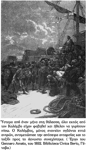 ... Bλέπουν θαλασσοπούλια και τροπικά πουλιά. Eίναι καλά σημάδια. Aλλά δεν βλέπουν στεριά. Bλέπουν και άλλα πουλιά και μικρά νησιά από φύκια να επιπλέουν, παλιά και φρέσκα. Tο πλήρωμα ζητάει να αλλάξουν πορεία και να ψάξουν για τα νησιά που πρέπει να υπάρχουν κάπου εκεί κοντά. O Nαύαρχος εξηγεί ότι δεν θέλει να σπαταλήσει χρόνο σε τέτοια πράγματα. Θέλει να φτάσει στις Iνδίες το συντομότερο δυνατόν.
