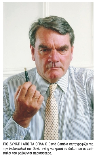 O David Irving είναι γιος πλωτάρχη του Βρετανικού Ναυτικού. Σπούδασε στο Imperial College of Science and Technology και στο University College του Λονδίνου, ενώ στη συνέχεια εργάστηκε για ένα χρόνο στην Γερμανία σε εργοστάσιο χάλυβα τελειοποιώντας τις γνώσεις του στη γερμανική γλώσσα. Τα γνωστότερα από τα 30 βιβλία του είναι ΤΑ ΙΧΝΗ ΤΗΣ ΑΛΕΠΟΥΣ: Ο ΘΑΝΑΤΟΣ ΤΟΥ ΣΤΡΑΤΗΓΟΥ ΣΙΚΟΡΣΚΙ, ΑΝΟΔΟΣ ΚΑΙ ΠΤΩΣΗ ΤΗΣ ΛΟΥΦΤΒΑΦΕ, ΓΚΑΙΡΙΝΓΚ: ΜΙΑ ΒΙΟΓΡΑΦΙΑ ΚΑΙ ΝΥΡΕΜΒΕΡΓΗ, Η ΤΕΛΕΥΤΑΙΑ ΜΑΧΗ. Έχει μεταφράσει πολλά έργα άλλων συγγραφέων και ζει στην Πλατεία Γκρόσβενορ του Λονδίνου μαζί με τις πέντε κόρες του. Το 1963 δημοσίευσε το βιβλίο του Η ΚΑΤΑΣΤΡΟΦΗ ΤΗΣ ΔΡΕΣΔΗΣ, που έγινε μπεστ σέλερ σε πολλές χώρες. Το 1966 κυκλοφόρησε μια αναθεωρημένη έκδοση του βιβλίου του ΑΠΟΚΑΛΥΨΗ 1945, καθώς και την πολύ σημαντική βιογραφία ΓΚΑΙΜΠΕΛΣ, Ο ΚΟΡΥΦΑΙΟΣ ΕΓΚΕΦΑΛΟΣ ΤΟΥ Γ΄ ΡΑΙΧ. ΄Ενας δεύτερος τόμος του έργου του Ο ΠΟΛΕΜΟΣ ΤΟΥ ΤΣΩΡΤΣΙΛ θα κυκλοφορήσει σύντομα.