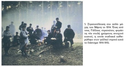 Οι φωτογραφίες του Α΄ Παγκοσμίου Πολέμου συνήθως απεικονίζουν μια γκρίζα πραγματικότητα, κυριολεκτικά αλλά και μεταφορικά. Στις ασπρόμαυρες της περιόδου αποτυπώνεται η λάσπη, η βροχή και το κρύο. Όμως, υπάρχουν και έγχρωμες φωτογραφίες του πολέμου. Τον Μάιο του 1915 συστάθηκε το Τμήμα Φωτογραφίας του Γαλλικού Στρατού, το οποίο είναι υπεύθυνο όχι για όλες, αλλά για τις περισσότερες από τις έγχρωμες εικόνες που ακολουθούν. Αποστολή του ήταν η καταγραφή του πολέμου με την πλήρη αξιοποίηση τών έως τότε διαθέσιμων μέσων. Ένα εξ αυτών ήταν η πρώτη έγχρωμη διαδικασία λήψης και εκτύπωσης φωτογραφιών (Autochrome Lumière) που επινόησαν οι αδελφοί Lumière το 1903 και η οποία άρχισε να διατίθεται εμπορικά το 1907. Η πρωτοπόρα εκείνη φωτογραφική μέθοδος βασιζόταν στην επεξεργασία με επιχρωματισμένα στρώματα που το καθένα ήταν ευαίσθητο στο πράσινο, το πορτοκαλί και το μωβ πάνω σε μια γυάλινη πλάκα απορρόφησης χρώματος. Οι λήψεις ήταν κυρίως στατικές σκηνές ή στημένες ομαδικές πόζες, καθώς η έκθεση στον φακό έπρεπε να διαρκεί μέχρι και δέκα δευτερόλεπτα. Μπορεί στο ακόλουθο φωτογραφικό υλικό να μην υπάρχουν στιγμιότυπα δράσης, και αναπόφευκτα στις περισσότερες φωτογραφίες να εικονίζονται Γάλλοι, αλλά η αξία αυτών των φωτογραφιών έγκειται στο ότι αποκαλύπτουν έναν διαφορετικό πόλεμο, όπου ο ουρανός μπορεί να είναι γαλανός, το γρασίδι να είναι πράσινο και οι στολές να είναι λιγότερο ξεθωριασμένες.