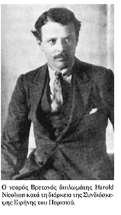 Ένα βαριά διακοσμημένο γραφείο, με τον τεράστιο χάρτη μου απλωμένο στο χαλί. Σκυμμένοι πάνω του, (μουρμουρίζοντας προβληματισμένοι), είναι ο Clemenceau, ο Lloyd George και ο PW. Έχουν μετακινήσει τις καρέκλες τους και σκύβουν πάνω από τον χάρτη. … Χαράσσουν τον σιδηρόδρομο της Βαγδάτης. Ο Clemenceau δεν μιλάει καθόλου. Κάθεται στην άκρη της καρέκλας του και τα δυο του χέρια, μέσα σε μπλε γάντια, κρέμονται πάνω από τον χάρτη. Μοιάζει, περισσότερο από ποτέ, με ξανθό γορίλα. … Είναι εξωφρενικό το γεγονός ότι αυτοί οι αδαείς και ανεύθυνοι άνδρες έχουν την άνεση να τεμαχίσουν τη Μικρά Ασία με την ίδια ευκολία που θα τεμάχιζαν ένα κέικ. … Άραγε δεν είναι φρικτό η ευτυχία εκατομμυρίων ανθρώπων να διασκορπίζεται με αυτόν τον τρόπο; Οι αποφάσεις τους είναι ανήθικες και ανέφικτες. … Είναι τρεις αδαείς άνδρες που έχουν για οδηγό τους ένα παιδί. … Αυτό το παιδί, υποθέτω, είμαι εγώ. Όπως και να 'χει, το παιδί αγωνιά.
