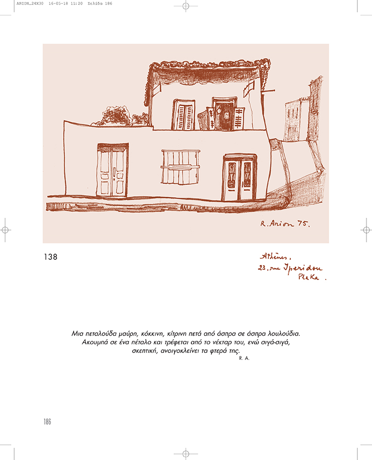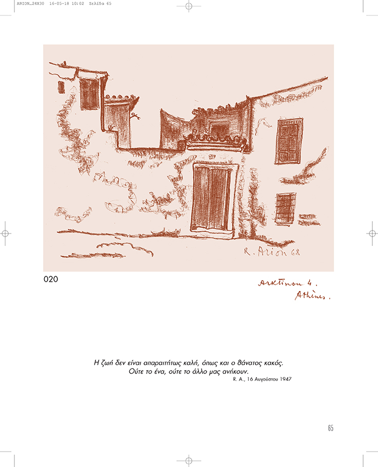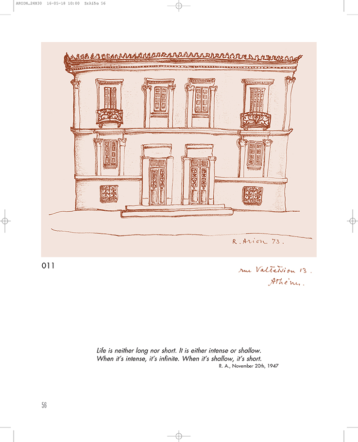 Ο Radu Arion, υπηρέτησε τα δύσκολα έτη από το 1938 έως το 1947 ως Επιτετραμμένος της Ρουμανίας στην Αθήνα. Στο τέλος της θητείας του επέλεξε να παραμείνει με την οικογένειά του στη χώρα, κάνοντάς τη δεύτερη πατρίδα του. Τα σχέδιά του, που για πρώτη φορά παρουσιάζονται εδώ, αποτελούν την απόδειξη της αγάπης του για την Ελλάδα.